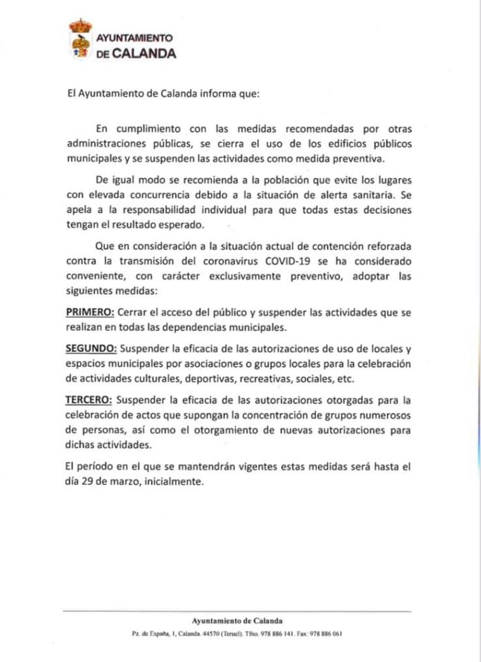 El Centro Buñuel Calanda, siguiendo el cumplimiento de las medidas recomendadas, permanecerá cerrado al público hasta el 29 de marzo, por la prevención del Coronavirus, se atiende tanto al correo electrónico como al teléfono para cualquier información de 10:30 a 13:30 y de 16:00 a 20:00 horas